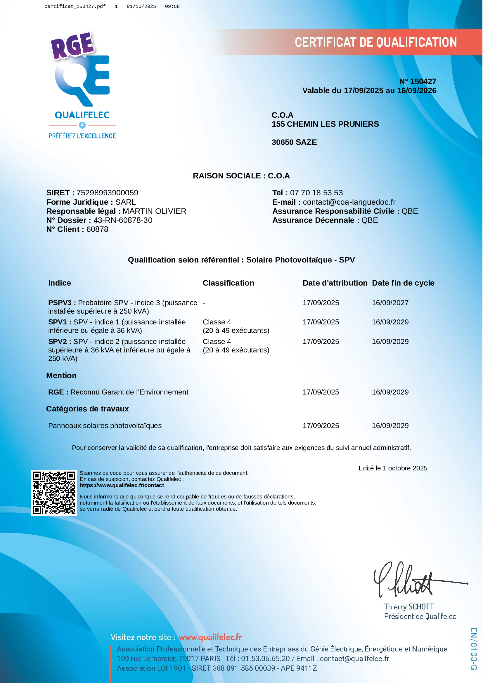 C.O.A est certifiée RGE c’est-à-dire, entreprise Reconnue Garant de l’Environnement. Cette certification est délivrée par l’organisme de qualification Qualit’EnR et est encadrée par la norme NF X50-091. La certification RGE s’applique aux entreprises énergétiques et atteste qu’elles respectent des critères rigoureux de compétence et de qualité dans l’installation de systèmes utilisant des énergies renouvelables.
